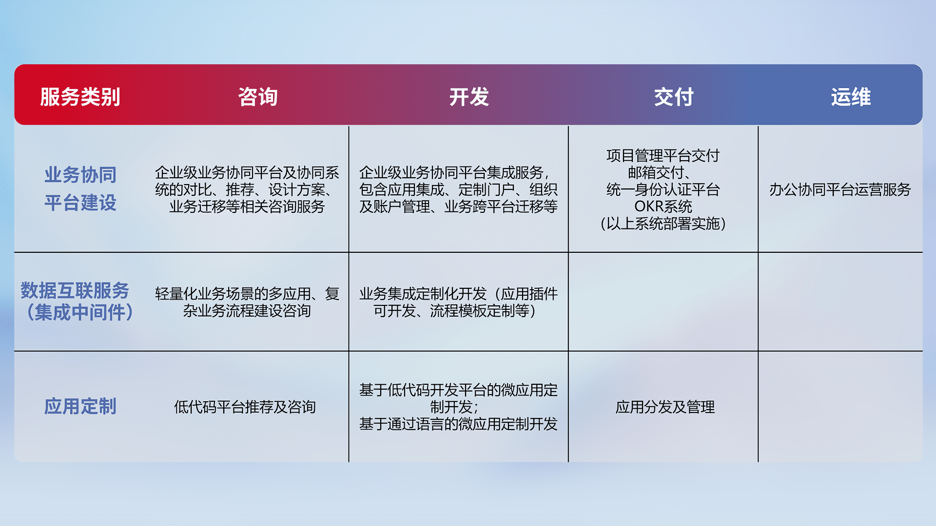 针对钉钉、、、、企微、、、IDaas等平台级产品提供产品的规划、、、方案、、、交付、、定制化开发等服务,,,,实现如统一协同办公、、、、智能客户服务、、混合会议管理、、、智能数据查询、、、、等业务场景,,实现数字化转型。。